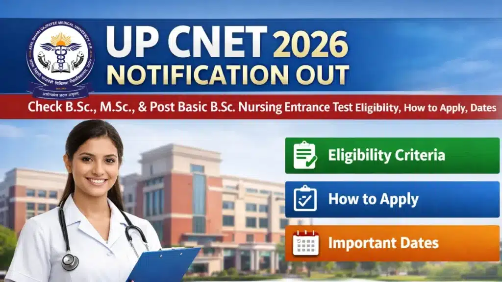 The UP CNET 2026 Notification has been officially released, bringing a major opportunity for candidates aspiring to pursue nursing courses in Uttar Pradesh. The Common Nursing Entrance Test (CNET) 2026 is conducted for admission into various nursing programs such as B.Sc Nursing, Post Basic B.Sc Nursing, and M.Sc Nursing offered by affiliated colleges. Interested candidates can now complete their online registration at the official website abvmuup.edu.in within the specified timeline.